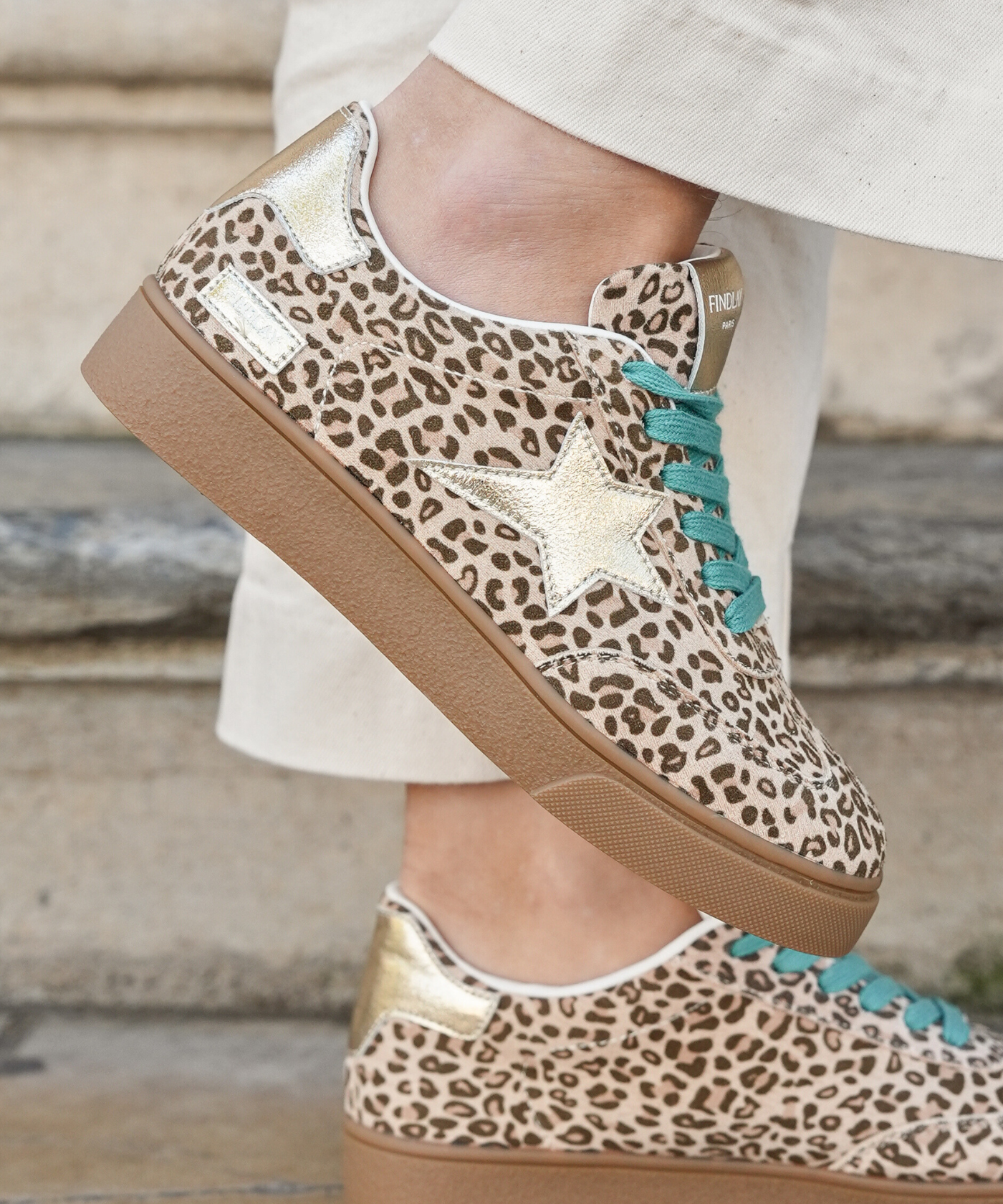 BASKETS LÉOPARD FEMME AVEC ÉTOILE ARGENT ET LACETS TURQUOISE
